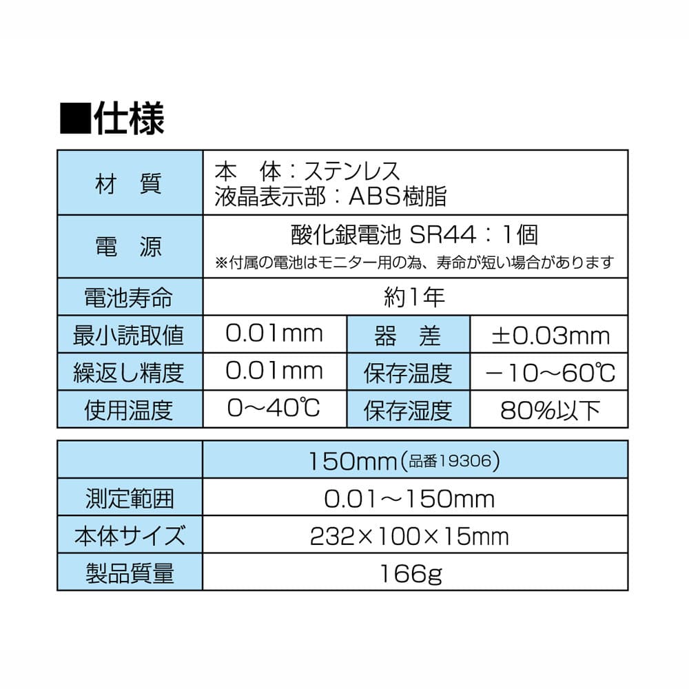 ●深さの測定に。●電源:ボタン型酸化銀電池(SR44)×1個(付属)●本体:ステンレス●スライダー:ABS樹脂●電池はモニター用となります。●用途以外使用しないでください。●メーカーコード:-●測定範囲(mm):0.01~150●器差(mm):±0.03●最小表示(mm):0.01●全長(mm):232●ベース寸法(mm):100