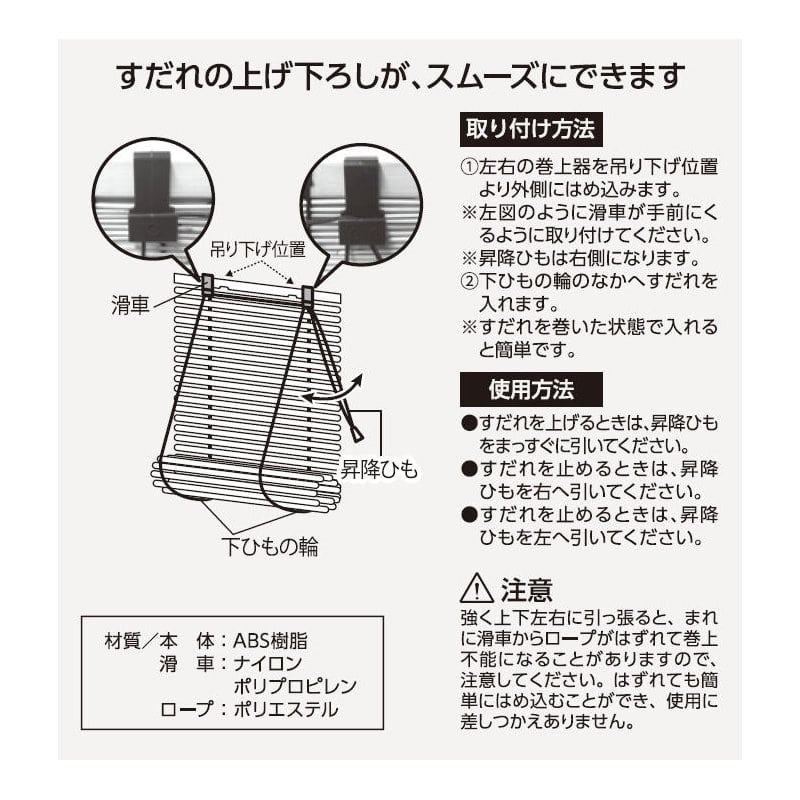 すだれの上げ下ろしがスムーズにできます。平丈にも丸竹にもお使いいただけます。長さ220cmまで対応致します。