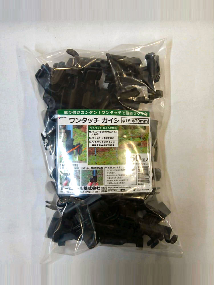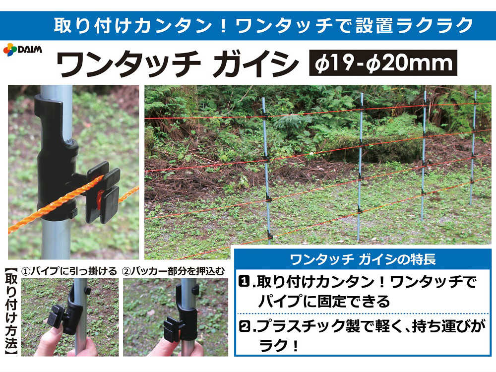 樹脂製のガイシなので錆びません。パッカー方式で取付出来るので、簡単、スピーディーです。19mmから20mmのパイプに取り付け出来ます。材質はポリプロピレンです。ガイシ以外の用途では使用しないでください。安全のため、必ず手袋等を着用して作業を行ってください。火の側や高温になる場所でのご使用はお止めください。
