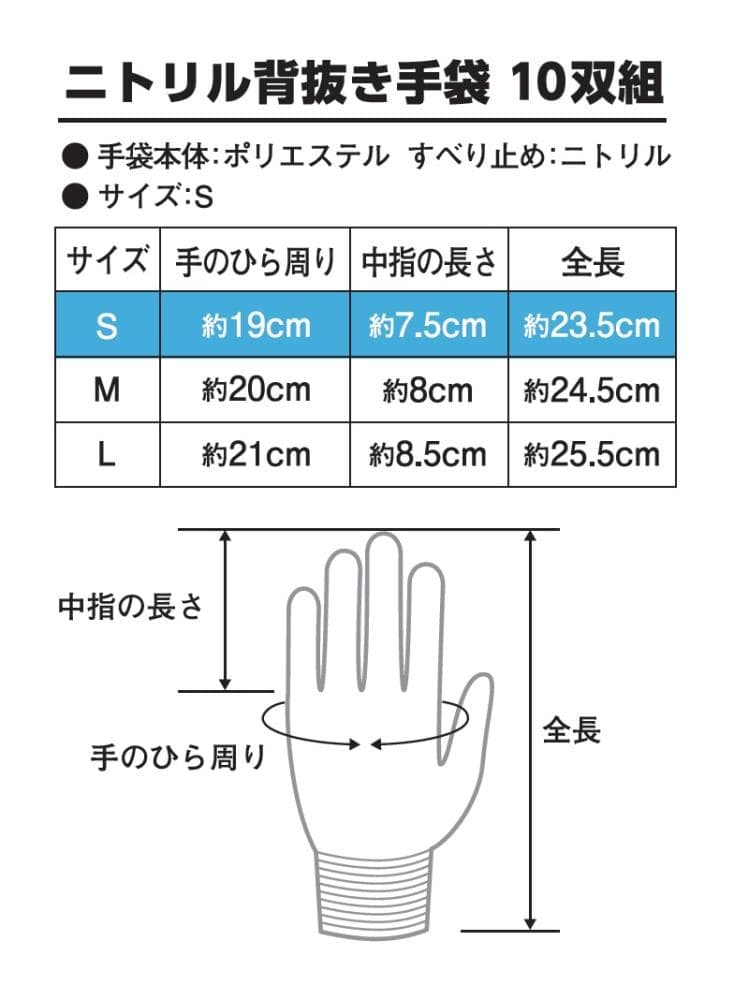単品サイズ:中指長さ:79mm、掌まわり:196mm、全長:235mm