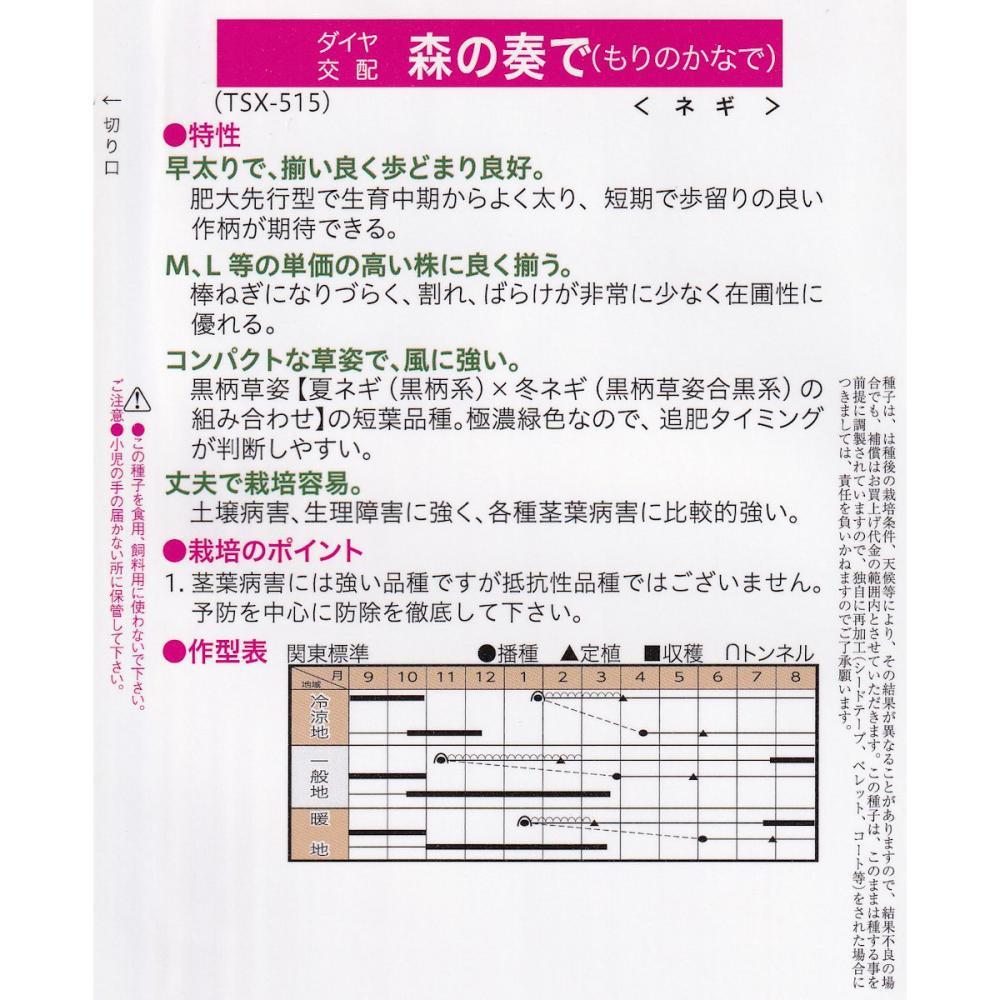 肥大先行型。生育中期からよく太り、短期間でM、L規格の高単価な株に良く揃う。棒ねぎになりづらく、割れ、ばらけが非常に少ない。置いておけば伸び上がらずに横に太り、L、2Lになり、在圃性に優れる。黒柄草姿【夏ネギ(黒柄系)×冬ネギ(黒柄草姿合黒系)】の短葉品種。極濃緑色なので、追肥タイミングが判断しやすい。土壌病害、生理障害に強く、各種茎葉病害に比較的強い。