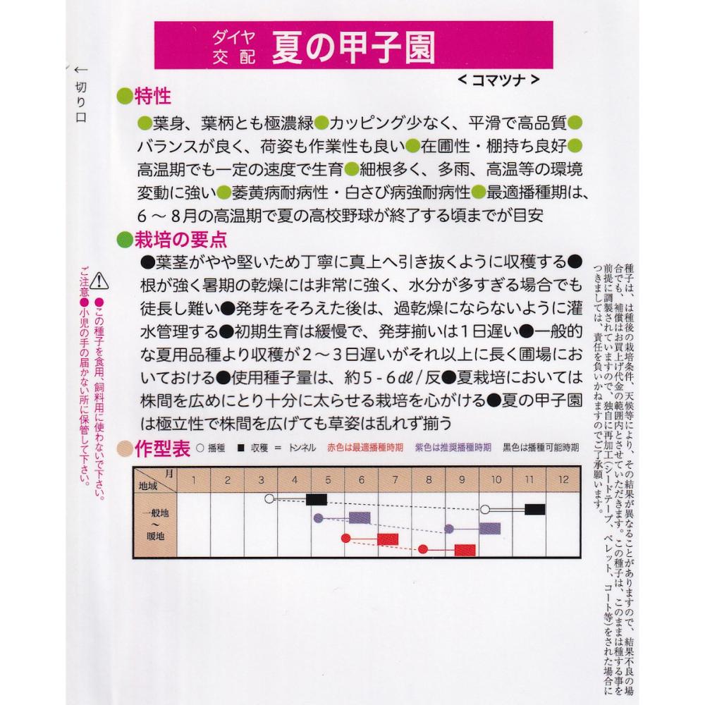 葉身、葉柄とも極濃緑。カッピング少なく、平滑で高品質。バランスが良く、荷姿も作業性も高い。在圃性良好。高温期でも一定の速度で生育。細根多く、多雨、高温等の環境変動に強い。萎黄病耐病性・白さび病強耐病性。最適播種期は、6~8月の高温期で夏の高校野球が終了する頃までが目安。第62回全日本野菜品種審査会にて銀牌受賞。外食業界ではゆでた後にタッパーなどで保管し利用するが、保存が長く出来る事とゆで時間が長くても煮崩れない点が評価されて指名栽培、指名買いに繋がっている。