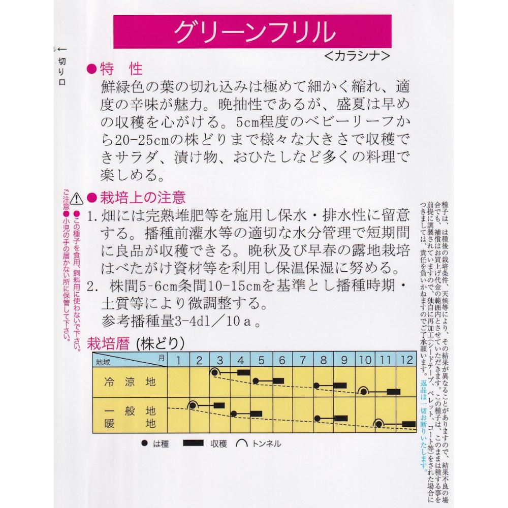 鮮緑色の葉は極めて細かく縮れる。適度な辛味がある。5cm程度のベビーリーフから20~25cmの株どり。サラダ、漬け物、おひたしなど多くの料理で楽しめる。晩抽性であるが、盛夏は早めの収穫を心がける