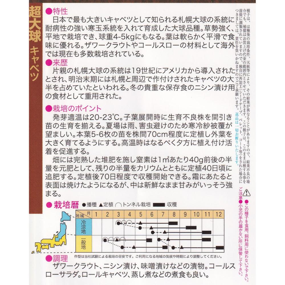 定植後70日程度で球径30~40cm、球重4-5kg。葉は軟らかく平滑で食味に優れる。草姿強く、平地で栽培できる。霜にあたると表面は焼けたようになるが、中は新鮮なまま甘みがいっそう強まる。直売所主催の大きさコンテストやアイキャッチとして栽培しても面白い。