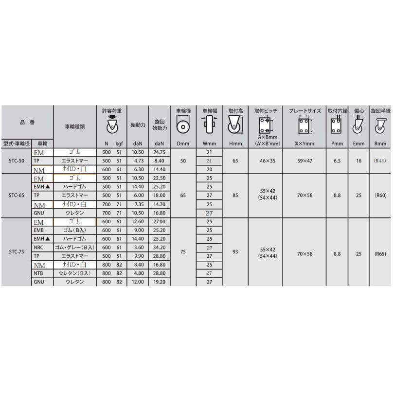 ●材質:エラストマー●耐荷重:51kgf●STCシリーズ用途:各種搬送台車、ロールボックスパレット、什器等、各種業務用機材~家庭用品まで。
