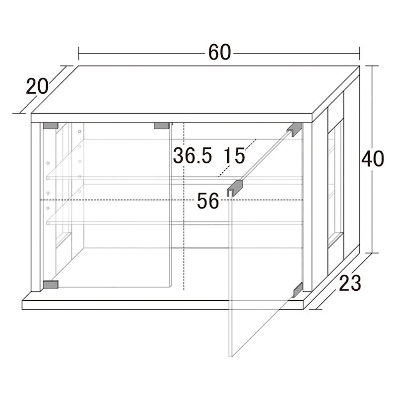 ■扉内寸:約幅56×高さ36.5×奥行15cmです。可動棚約幅56×奥行15×厚み0.5cm、2枚付。約3.3cmピッチ5ヶ所移動可能。