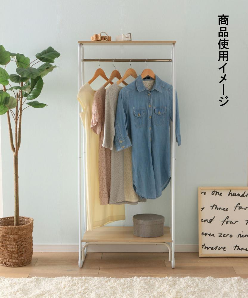 ●素材:ハンガーパイプ:メッキ塗装、パイプ:粉体塗装、棚板:プリント紙化粧パーティクルボード ●耐荷重(約):全体25kg、パイプ10kg、棚板1枚あたり(上)5kg、(下)10kg ●収納の目安:ジャケット等の冬物 約10着、シャツ・ブラウス等の夏物 約18着