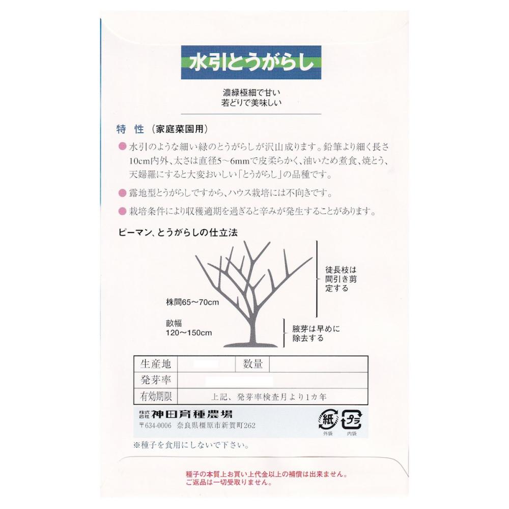 水引のような細い緑のとうがらしが沢山成ります。鉛筆より細く長さ10cm内外、太さは直径5~6mmで皮柔らかく、油いため、煮食、焼とう、天婦羅にすると大変おいしい「とうがらし」の品種です。露地型とうがらしですから、ハウス栽培には不向きです。栽培条件により収穫適期を過ぎると辛みが発生することがあります。