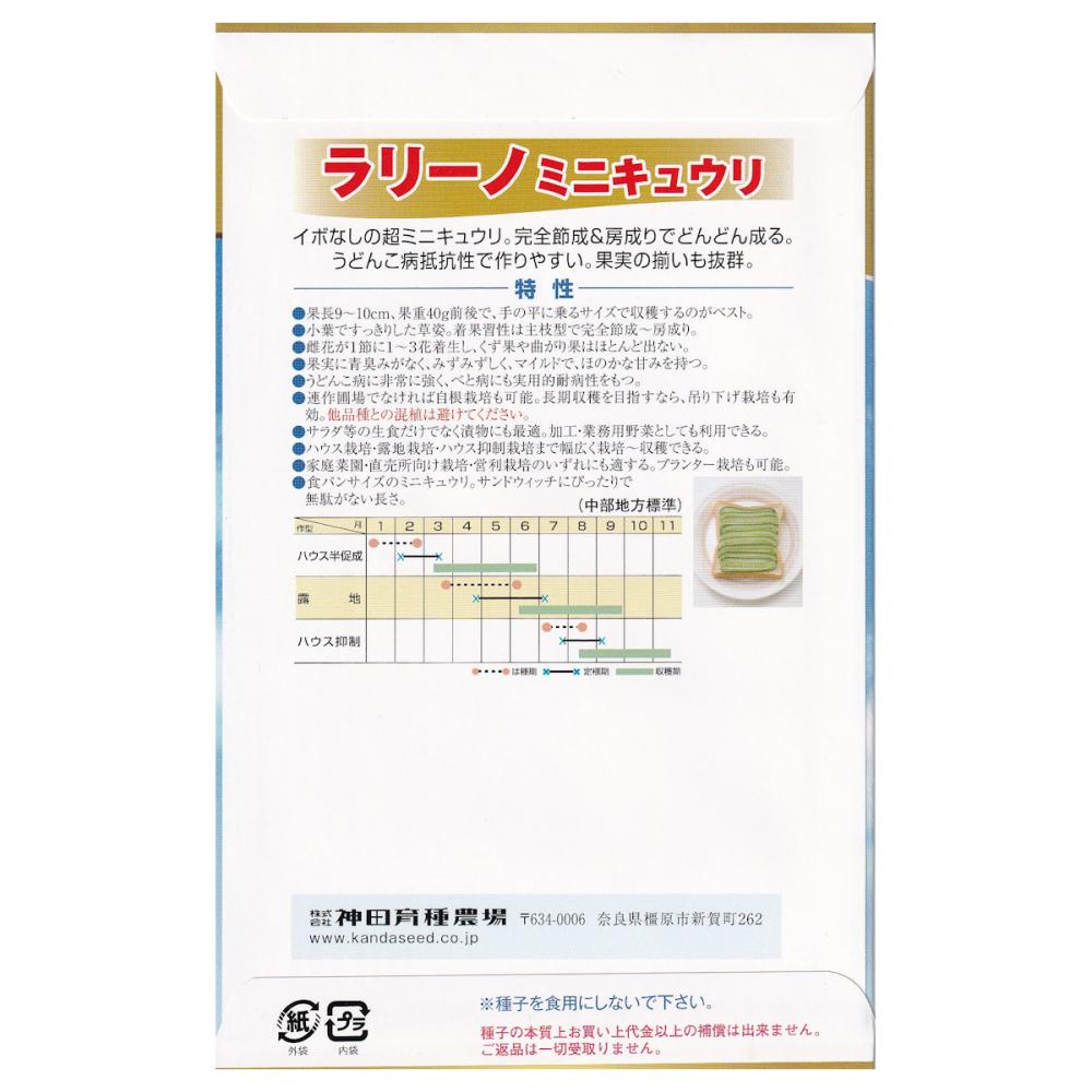 果長9~10cm、果重40g前後で、手のひらに乗るサイズで収穫するのがベスト。小葉ですっきりした草姿。着果習性は主枝型で完全節成~房成り。雌花が1節に1~3花着生し、くず果や曲がり果はほとんど出ない。果実に青臭みがなく、みずみずしく、マイルドでほのかな甘みをもつ。うどんこ病に非常に強く、べと病にも実用的耐病性をもつ。連作圃場でなければ自根栽培も可能。長期収穫を目指すなら、吊り下げ栽培も有効。サラダ等の生食だけでなく漬物にも最適。加工・業務用野菜としても利用できる。