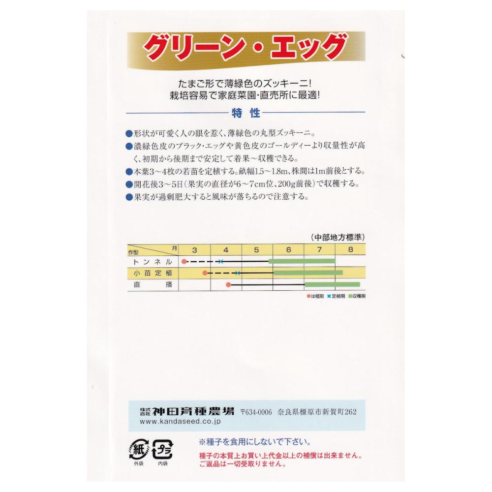 薄緑色のたまご形ズッキーニ。雌花が連続して着生し、次々と着果~収穫できる楽しい品種。つるなしで、耐病性が強く、作り易く、面積を取らないので家庭菜園に最適である。果肉は柔らかく、食味にクセがないので、炒め物、煮物、電子レンジ等、幅広く調理できる。本葉3~4枚の若苗を定植する。畝幅1.5~1.8cm、株間は1m前後。開花後3~5日(果実の直径が6~7cmくらい、200g前後)で収穫する。まれに雌花が開花せず、受粉することなしに果実が肥大する(単為結果)場合がありますが、その果実も食用にできます。