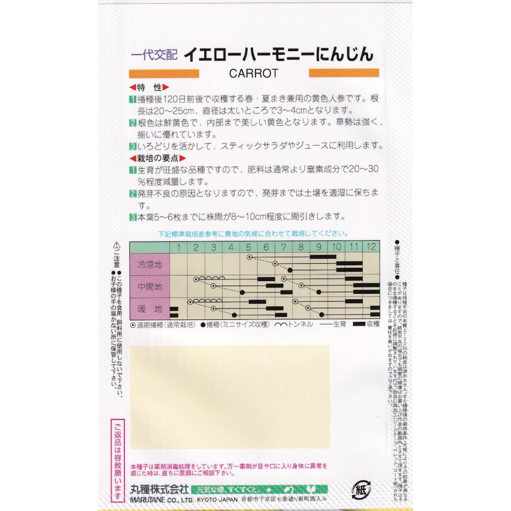 播種後120日前後で収穫する春・夏まき兼用の黄色人参です。根長は20~25cm、直径は太いところで3~4cmとなります。根色は鮮黄色で、内部まで美しい黄色となります。草勢は強く、揃いに優れています。いろどりを活かしてスティックサラダやジュースに利用します。