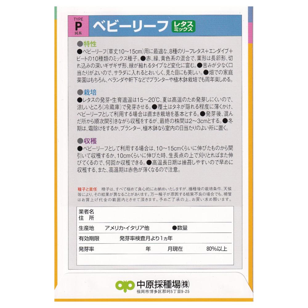 ベビーリーフ(草丈10~15cm)用に最適な、8種のリーフレタス+エンダイブ+ビートの10種類のミックス種子。赤、緑、黄色系の混合で、葉形は長卵型、切れ込みの深いギザギザ形、縁が縮れるタイプなど変化に富む。苦味が少なく口当たりがよいので、サラダに入れるとおいしく、見た目にも美しい。畑での家庭菜園はもちろん、ベランダや軒下などでプランターや植木鉢栽培でも周年楽しめる。