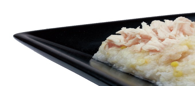 肉類(鶏胸肉、鶏もも肉、地どり胸肉、鶏ササミ、チキンエキス)、穀類(白米、もちきび、もち粟、丸麦、ひえ、アマランサス)、増粘多糖類、ミネラル類(カリウム)、酸化防止剤(EDTA‐Ca・Na)