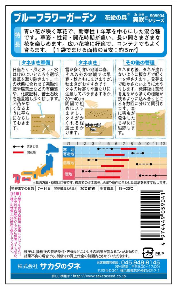 青い花が咲く草花で、耐寒性1年草を中心にした混合種です。草姿・性質・開花時期が違い、長い間さまざまな花を楽しめます。広い花壇に好適で、コンテナでもよく育ちます。