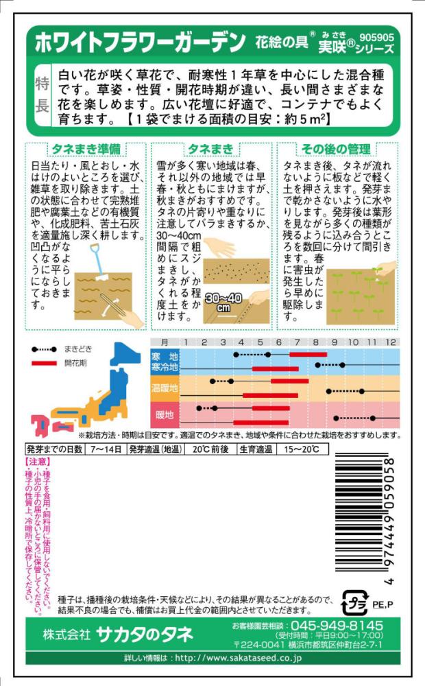 白い花が咲く草花で、耐寒性1年草を中心にした混合種です。草姿・性質・開花時期が違い、長い間さまざまな花を楽しめます。広い花壇に好適で、コンテナでもよく育ちます。