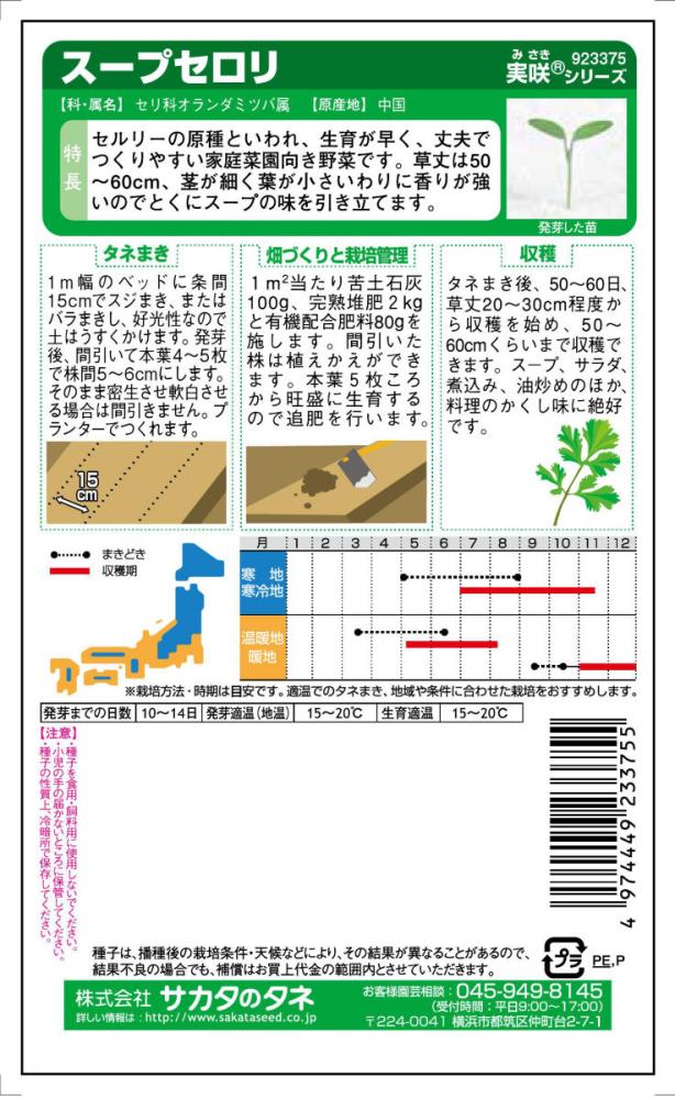 セルリーの原種といわれ、生育が早く、丈夫でつくりやすい家庭菜園向き野菜です。草丈は50~60cm、茎が細く葉が小さいわりに香りが強いのでとくにスープの味を引き立てます。