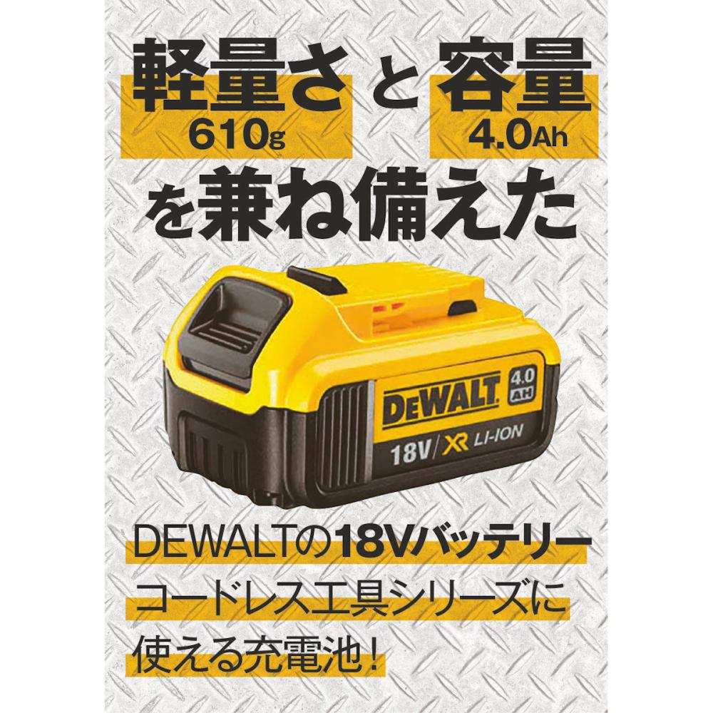 ●DCB182 18V XR 4Ah バッテリーは、すべてのDEWALT製18Vツールと互換性があります。 ●瞬時に充電状態を確認できるLED 残量ゲージ機能 ●DEWALT XR4.0Ah リチウムイオンバッテリーテクノロジーは、ランタイム向上と最適化された電力を提供し、アプリケーションを迅速に完了します。