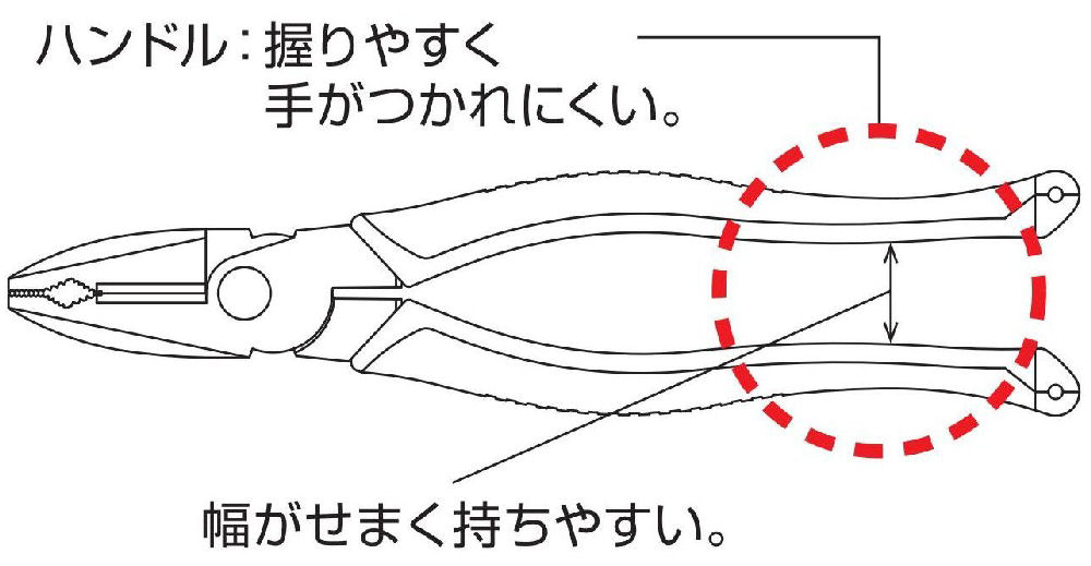 ●建築・土木・電気工事等幅広く使用できます。●手になじみやすいエラストマー樹脂グリップです。●落下防止ストラップ取付用のグリップ穴が付いています。