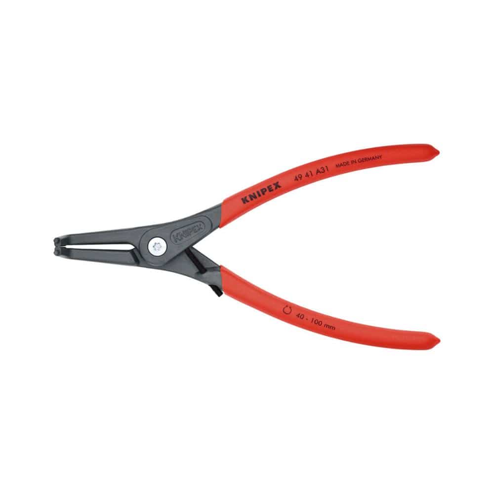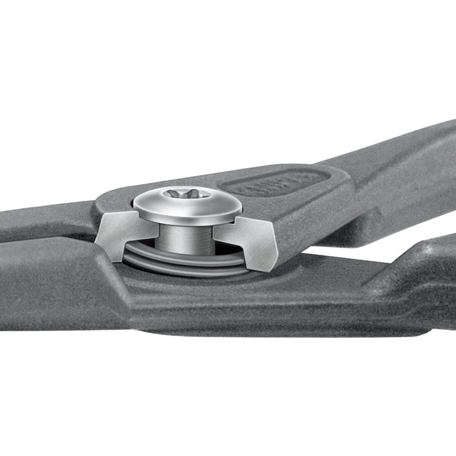 ●ヘッド仕上げ:グレー防錆コート●ハンドル仕上げ:プラスチックコーティング(滑り防止仕上げ)●差込先端部仕上げ:ばね鋼線引き抜き加工●プライヤーボディ材質:クロムバナジウム電気鋼(油焼き入れ)●対応シャフト径(径mm):40-100●先端チップ径(径mm):2.3●先端曲がり角度(°):90●全長(mm):210●質量(g):272●簡単に軸用スナップリングの取り付け、取り外しができます。●先端チップは強靭な特殊バネ鋼製。●長時間使用における高負荷に耐え、ツール寿命は一般的なスナップリングプライヤーの10倍以上です。●スクリュージョイントを採用しており、大変滑らかに可動します。●鍛造により大変頑丈です。●先端チップはリングとの接触面積が広いため、リングを歪めず確実に保持することができます。●スリムなヘッド形状により、狭い場所での作業も可能です。●90°ベントヘッド。●スプリングはジョイント部に内蔵し保護されているので、作業の邪魔にならず、汚れたり失くしたりしません。●ストッパーによって調整可能なクロージングリミッター付き。●ソケットヘッドネジによって調整。●リングの過度の膨張が有効に防止されるため、連続生産に最適。●高硬度ばね鋼製の先端部はポジティブ結合によって取り付け、圧着されているので、固くはまり込んだスナップリングを取り外す場合など、過度な負荷でも非常に安定しています。●広い接触面と先端部のポジションにより、リングが飛び出し難くなっています。●先端部には、刻み目のない高硬度ばね鋼製が使用されています。●先端部は動的にも静的にも高い負荷に耐えます。●開き制限ガードが付いているので、規格に合うだけでなく耐久性にも優れています。※作業の際には必ず安全ゴーグルを着用して下さい。