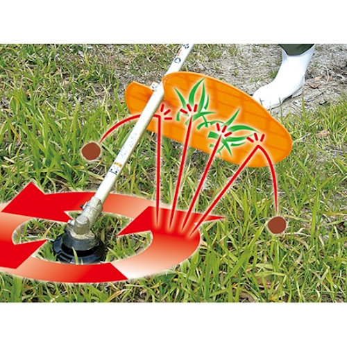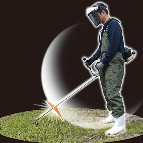 大型ワイド形状により、草刈り作業時の身体方向への飛散物を大幅に軽減します。 PP樹脂と独自の補強構造により丈夫で軽量です。 刈払刃使用時はもちろん、特に飛散物の多いナイロンコード使用時に最適です。