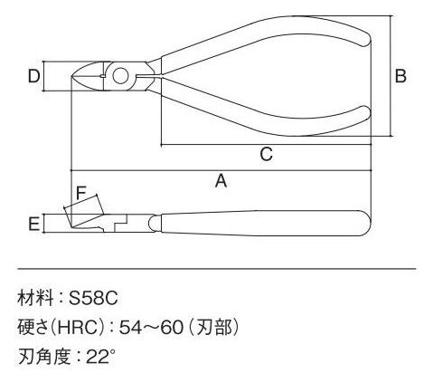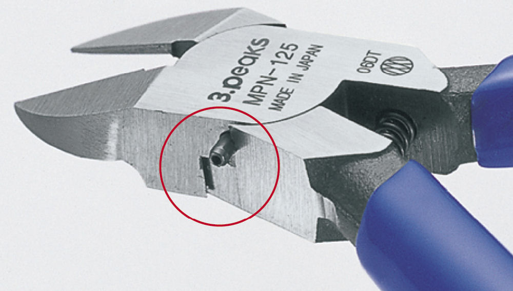 シリーズ唯一の刃角度。全長125mmで、細かく入り組んだ作業に対応します。 ●刃部くい違い防止ストッパー付。 ●開きすぎ防止ピン付。 ●連続作業が楽なコイルバネ付。 【切断能力】 プラスチック:3.0mm