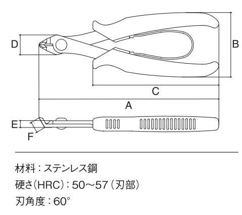 超軽量な板タイプ。 ●手になじみやすいエラストマー樹脂グリップ。 ●連続作業が楽なバネ付。 【切断能力】 銅線:1.0mm より線:2.0mm
