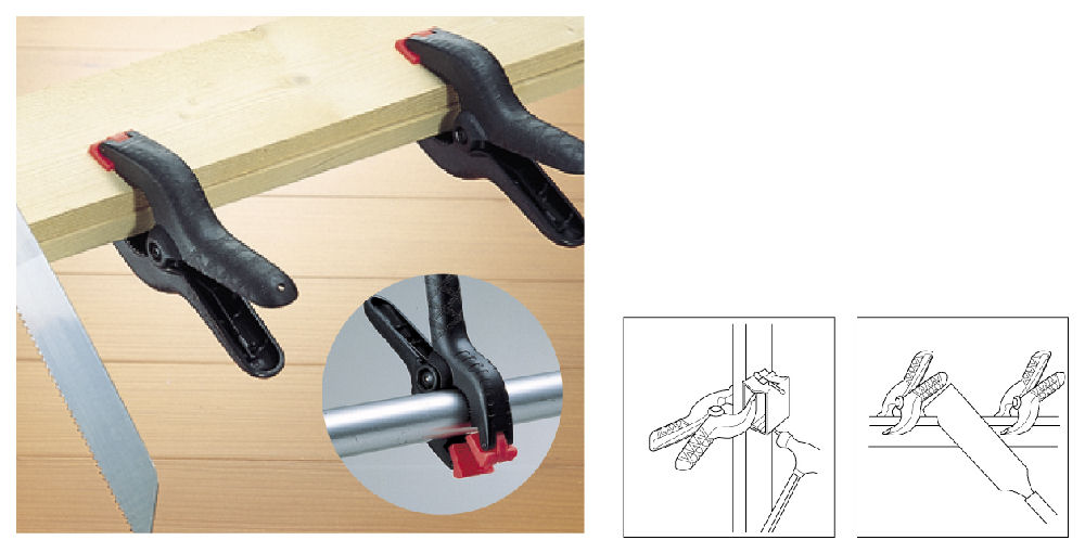簡易クランプ。くわえ部が可動するため、さまざまな厚みの素材を平行につかめます。 本体は軽く、耐久性にすぐれています。加工物に傷をつけません。 【使用範囲】 厚さ80mmまで