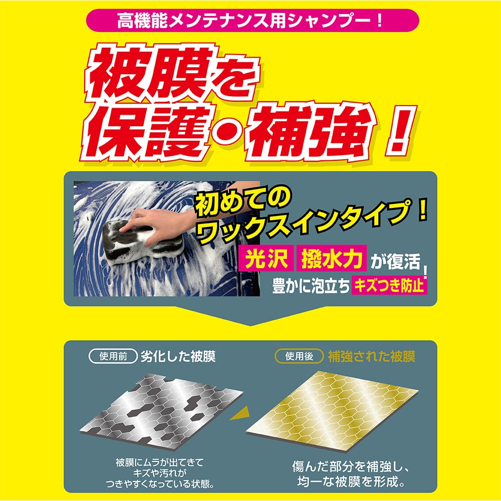 シャンプー洗車するだけで、効果の弱まってきたコーティング被膜を修復しつるつるの艶感をよみがえらせ、撥水効果をも付与する、プロ施工コーティングの専用シャンプーです。