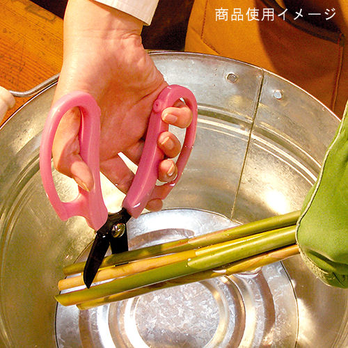 高炭素刃物鋼使用による抜群の切れ味が特徴の花切り鋏です。炭素の含有量が多い鋼を使用し、硬さと粘りのある刃部を実現しました。植物の水管を傷めない、優れた切れ味が特徴です。刃部にフッ素樹脂加工を施しており、水切り後のサビを防止します。ヤニ・サビがつきにくいため、切れ味の劣化を防ぎます。