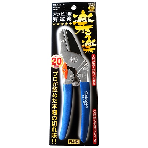 押切型で太い枝を切っても手にかかる衝撃が少なく連続で作業しても手への負担が少ないのも特徴です。刃部は刃物鋼にフッ素樹加工を施しておりサビヤニに強く切れ味抜群です。ワンタッチストッパーで簡単開閉できます。