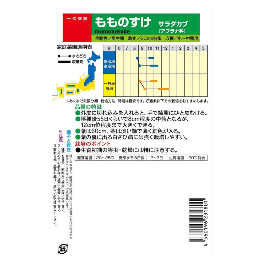 外皮に切れ込みを入れると、手で綺麗にひと皮むける。播種後55日くらいで8cm程度の中蕪となるが、12cmくらい程度まで大きくできる。葉は60cm、茎は淡い緑で薄く紅色が入る。葉の裏に出る白さび病には強く栽培しやすい。