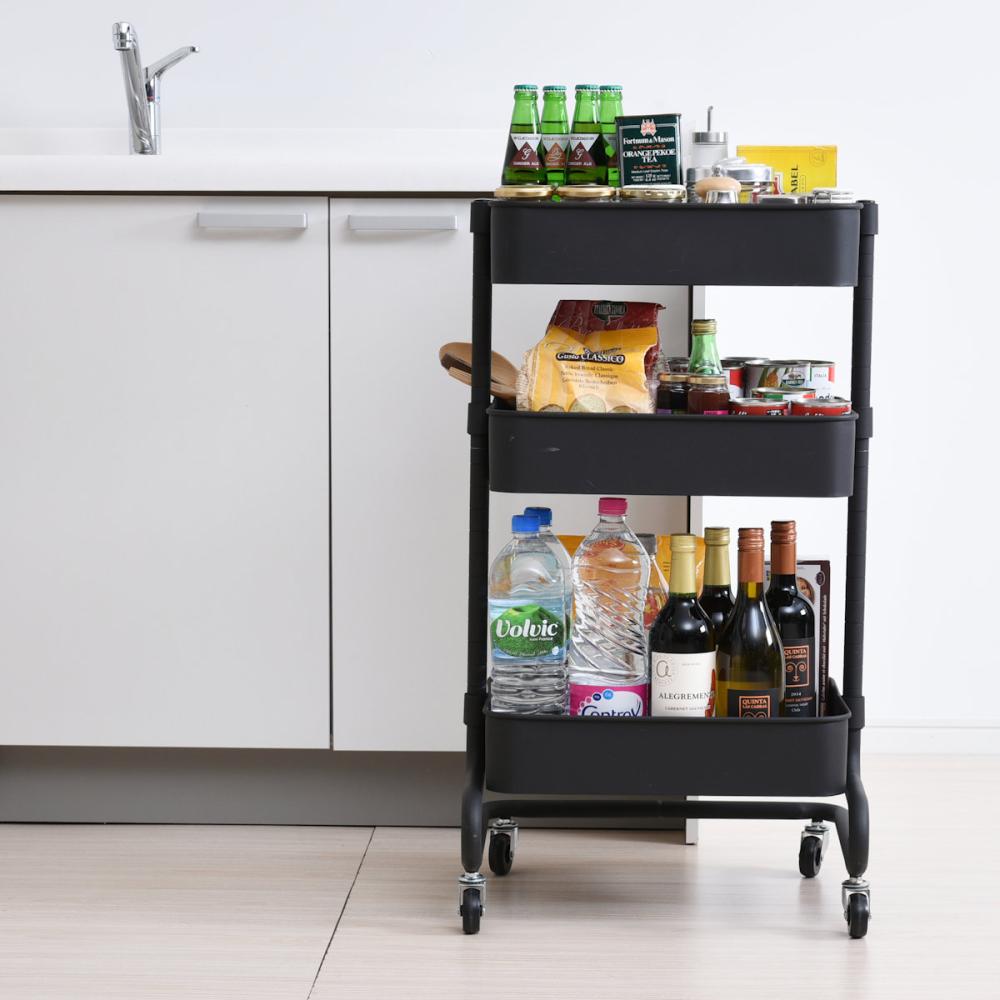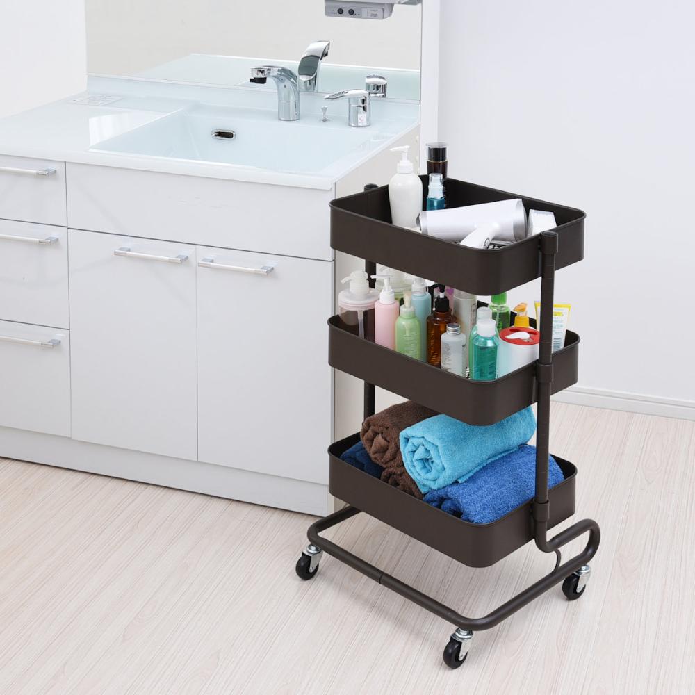 ■上から放り込める、バスケットタイプのキャスター付きワゴン ■バスケットの底は、野菜やタオルの収納にも合う、通気性の良いメッシュタイプ。 ■3つのバスケットはモノに合わせて、2.5cm間隔、23段階で高さを選んで設置可能 ■重量キャスターで、重いモノが載ってもスイスイ移動