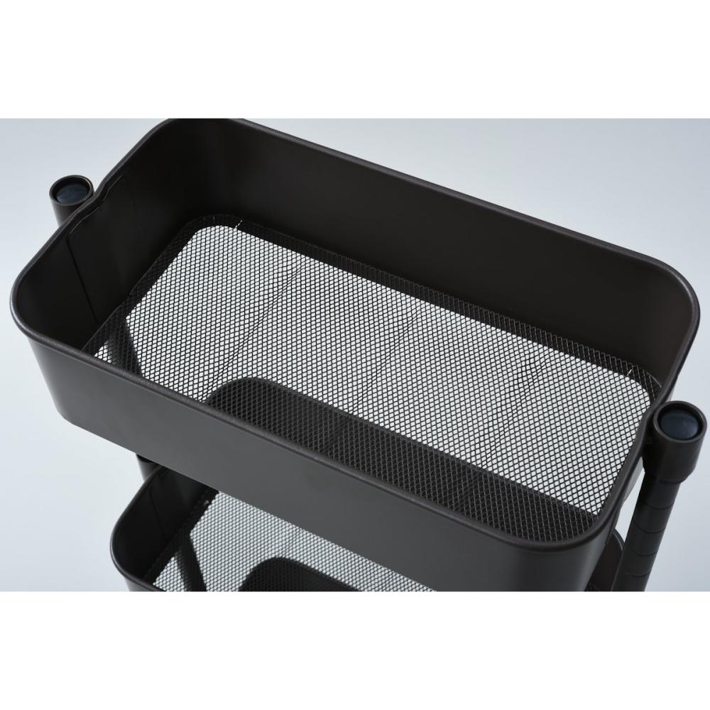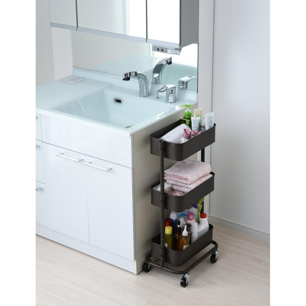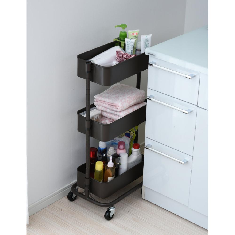 ■上から放り込める、バスケットタイプのキャスター付きワゴン ■バスケットの底は、野菜やタオルの収納にも合う、通気性の良いメッシュタイプ。 ■3つのバスケットはモノに合わせて、2.5cm間隔、23段階で高さを選んで設置可能 ■重量キャスターで、重いモノが載ってもスイスイ移動