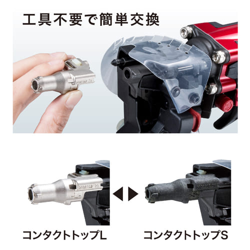 交換式(工具不要)コンタクトトップ&太径ドライバーにより、様々な種類の釘を正確に打ち込み可能。 片手で使えるエアダスタ。 ベストなストローク量で低反動を実現。 排気量・エア消費量を抑えることで低騒音を実現。 標準付属品:コンタクトトップL、コンタクトトップS、ノーズアダプタ、六角棒スパナ4、油さし、セフティゴーグル。