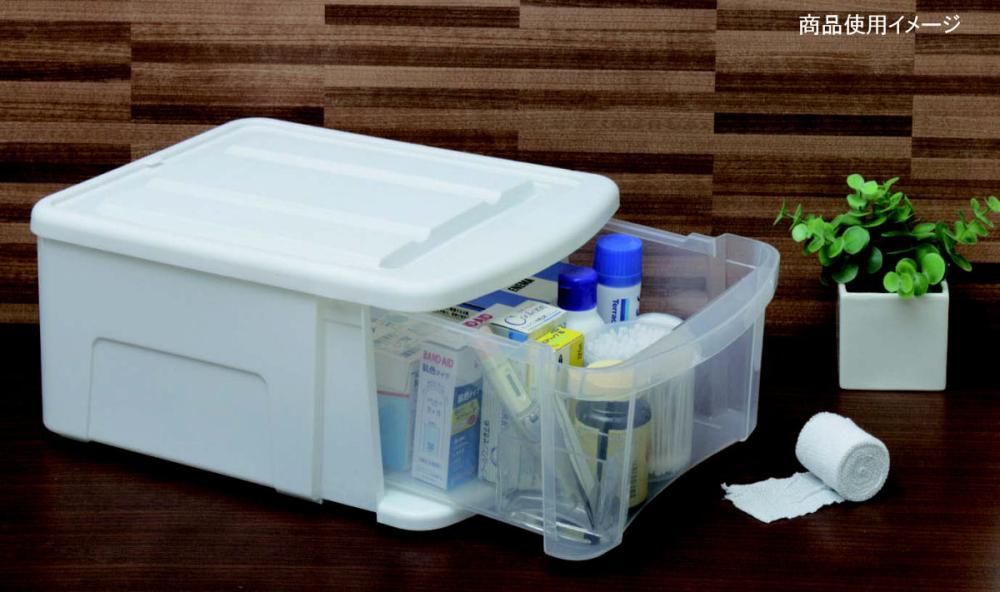 中身が見えるクリアタイプで、シーンを選ばず使えるシンプルなチェストです。 重ねた状態で引出しを引いた時の本体の傾き・持ち上がりを防ぐ為、天面に前倒れ防止加工を施しました。