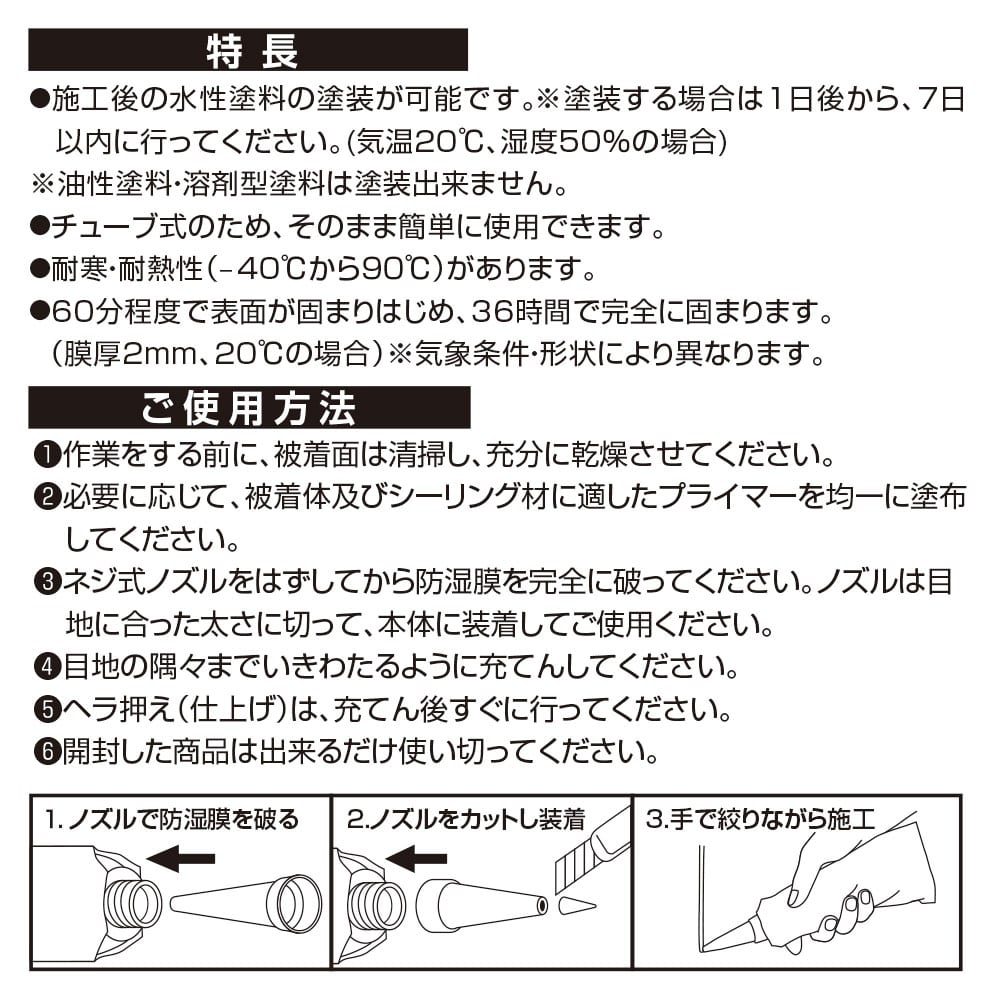 目地、防水シール、ヒビ割れ、亀裂、穴の接着、充填に使用。施工後水性塗料の塗装が可能。