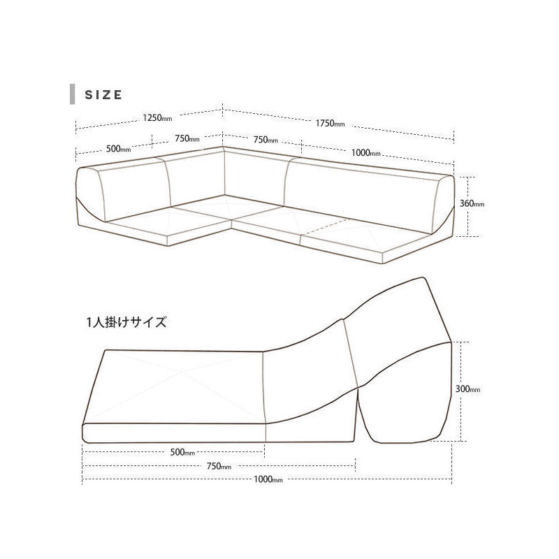 サイズ:3種類を使用してL字型にした時/約幅175×高さ36cm×奥行125cm