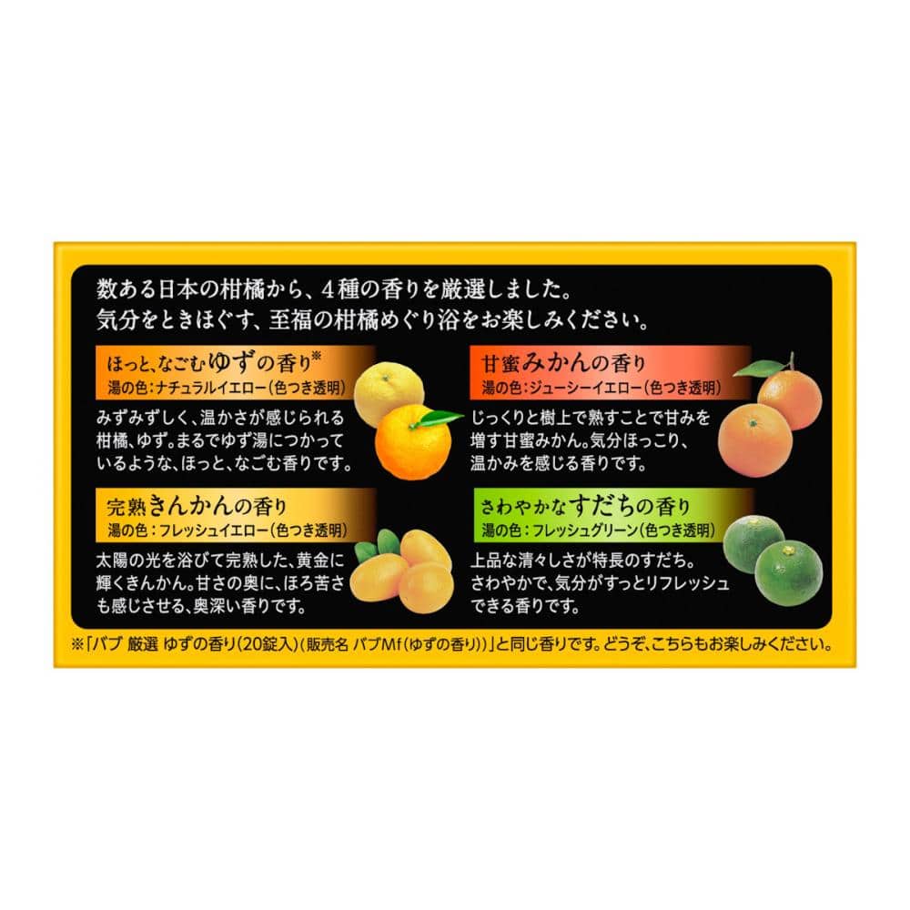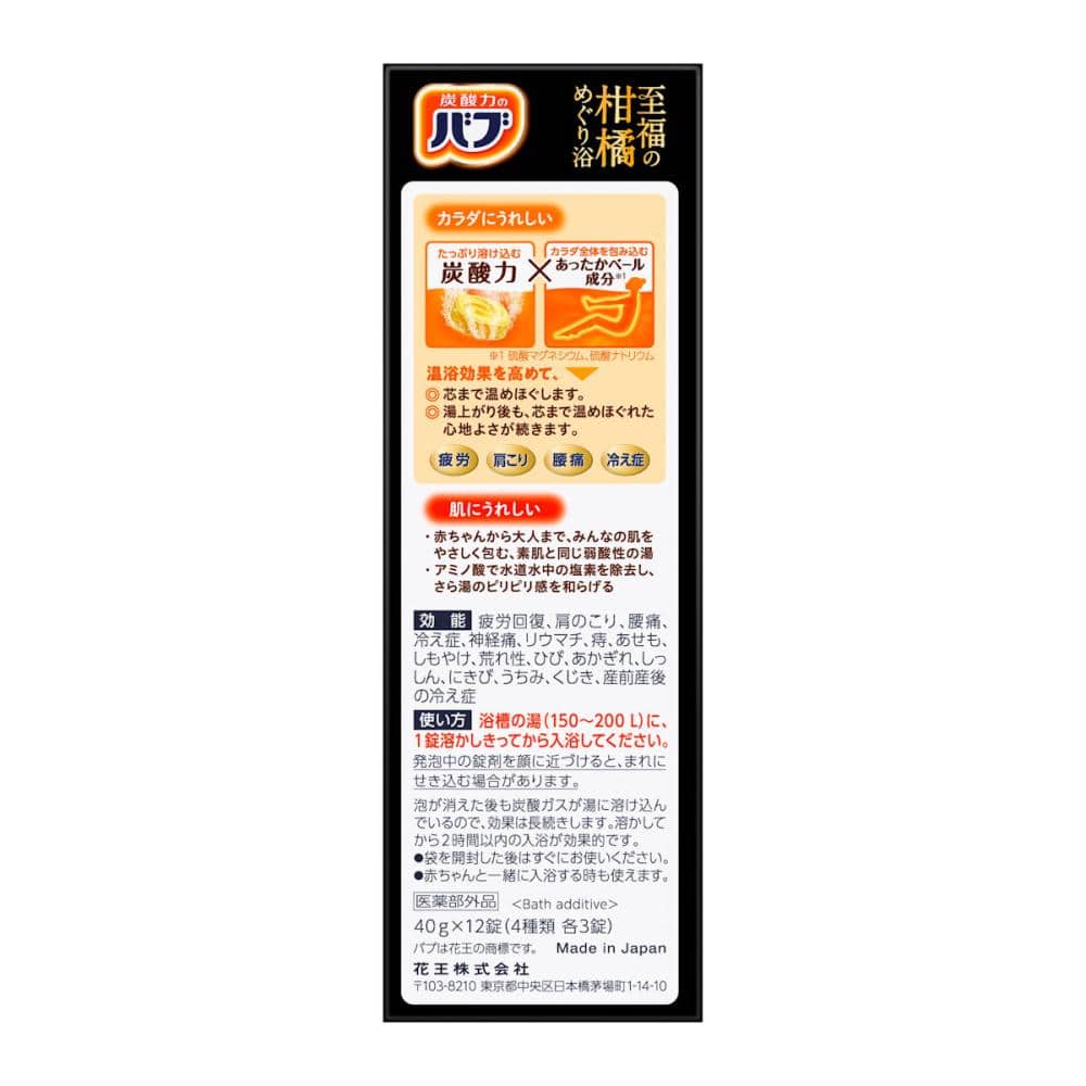 数ある日本の柑橘から、4種の香りを厳選。 (ほっと、なごむゆずの香り・完熟きんかんの香り・甘蜜みかんの香り・さわやかなすだちの香り) 気分をときほぐす、至福の柑橘めぐり浴をお楽しみください。 さら湯よりもっといたわるお湯質※に。 塩素除去剤(アミノ酸)配合。 素肌と同じ弱酸性の湯。 「炭酸力」が温浴効果を高めて芯まで温めほぐす!短め入浴にも。 疲労・肩こり・腰痛・冷え症に。【医薬部外品】 ※湯ざわり