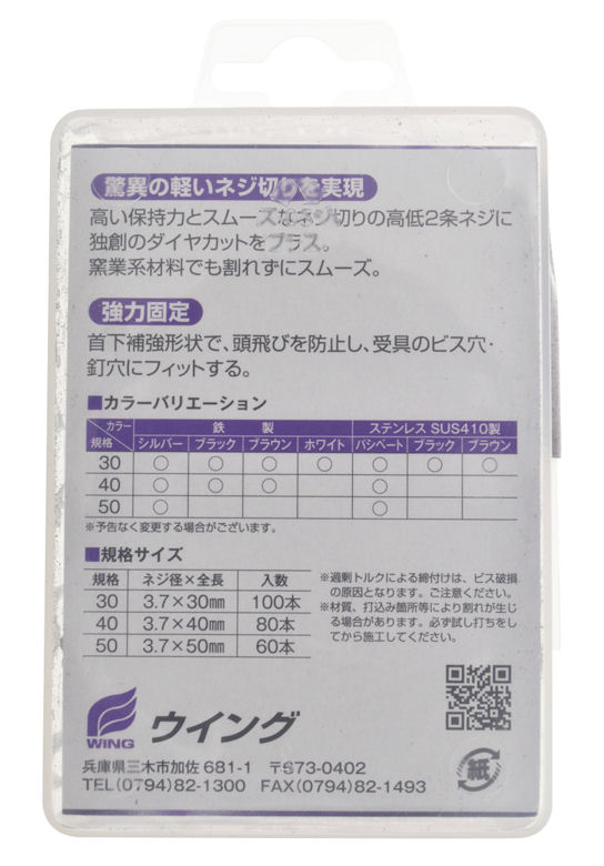 首下補強形状で頭飛びを防止します。高い保持力とスムーズなねじ切りの高低二条ねじにダイヤカットをプラス。窯業系材料でも割れずにスムーズに入ります。
