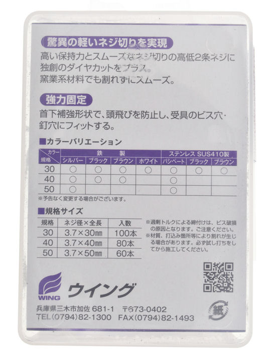 首下補強形状で頭飛びを防止します。高い保持力とスムーズなねじ切りの高低二条ねじにダイヤカットをプラス。窯業系材料でも割れずにスムーズに入ります。