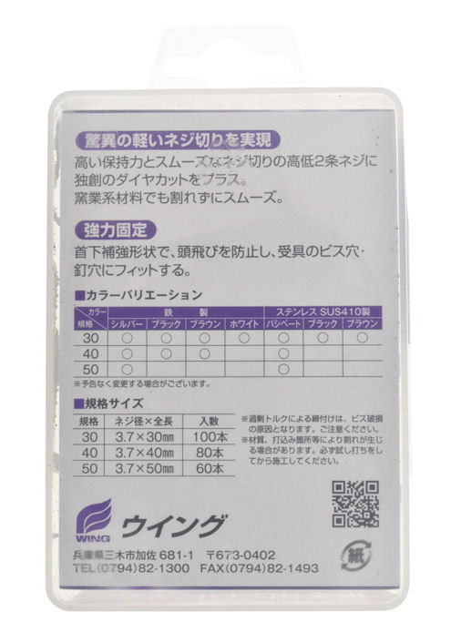 首下補強形状で頭飛びを防止します。高い保持力とスムーズなねじ切りの高低二条ねじにダイヤカットをプラス。窯業系材料でも割れずにスムーズに入ります。