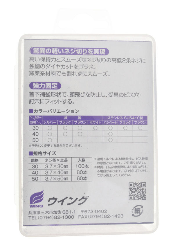 首下補強形状で頭飛びを防止します。高い保持力とスムーズなねじ切りの高低二条ねじにダイヤカットをプラス。窯業系材料でも割れずにスムーズに入ります。