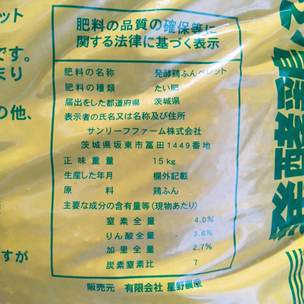 【肥料の品質の確保関する法律に基づく表示】 ●肥料の名称:発酵気ふんベレット ●肥料の種類:たい肥 ●届出をした都道府県:茨城県 ●表示者の氏名又は名称及び住所 サンリーフファーム株式会社 茨城県坂東市富田1449番地 ●正味重量:15kg ●生産した年月:商品に記載 ●原料:鶏ふん ●主要な成分の含有量等(現物あたり) ・窒素全量:4.0% ・りん酸全量:3.6% ・加里全量:2.7% ・炭素窒素比:7 ●販売元 有限会社 星野農産