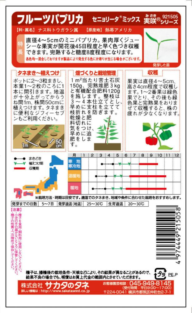 直径4~5cmのミニパプリカ。果肉厚くジューシーな果実が開花後45日程度と早く色づき収穫できます。 完熟すると糖度8度程度になります。 ※各色均一混合しておりますが製品によりは圧制する色に片寄りが生じる場合がございます。