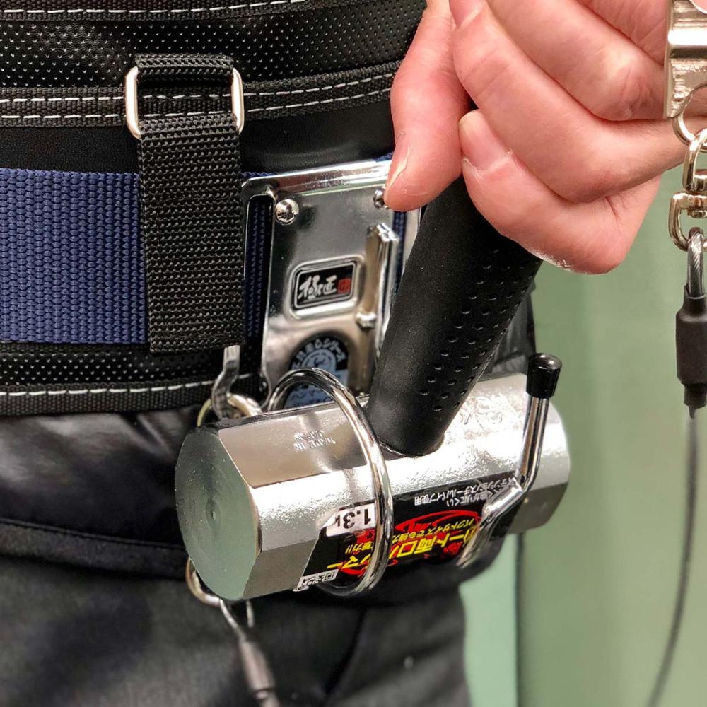 大サイズのハンマーを装着した場合は上部のフックに、小サイズのハンマーを装着した場合は下部のフックに接触するよう設計された特殊形状を採用。0.7K~1.3Kまでのハンマーから頭部の大きい重量ハンマーまでマルチに収納可能にしました。 グリップ(柄)挿入口の巾を細く設計しているので、ハンマー収納時にブラつきが解消され安定したバランスで収納が可能です。またフックの取出し口が広い為、ハンマーを出し入れする連続作業がスムーズに行えます。 落下防止効果のある丸リングは1.3Kのハンマーがスムーズに出し入れできるように、内径55mmの大口径リングを採用。スムーズな収納と落下防止を可能にしました。 線材の先端には怪我防止用の樹脂キャップを付けています。連続作業の多いハンマーの出し入れも安全に行うことが出来ます。 60mm幅までのベルトは本体に通してがっちり装着可能が出来、バネ鋼の差込口からベルトに挿入すればワンタッチ装着も可能です。 本体裏面はバネ鋼を使用し、さらに下部には落下防止用に角度が付いているのでベルトが外れにくい仕様となっています。さらにバネ鋼中央部の突起がベルトを押さえ、ズレを最小限に留めます。 安全ロープを左右どちらに取り付けても、下部に丸型スペースを採用したことでフック金具が自由に動け、作業性がとても良いです。軽量化にもつながっています。