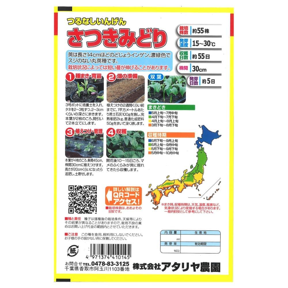 ●掲載のパッケージ画像(表側・裏側)に記載されている蒔き時期、収穫時期、発芽適温、発芽率、品種特長、その他注意事項をよくご確認の上、ご注文ください。