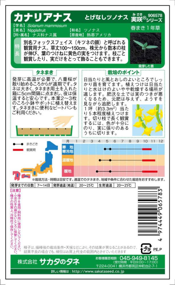 別名フォックスフェイス(キツネの顔)と呼ばれる観賞用ナス。 草丈1~1.5m、株元から数本の枝が伸び、葉のつけねに黄色の実をつけます。枝ごと観賞したり、実だけをとって飾ることもできます。