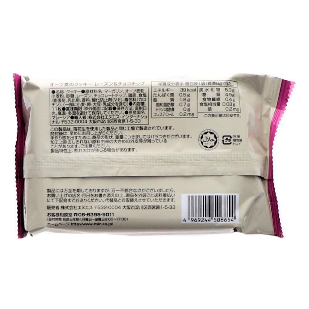 【原材料名】マーガリン、オーツ麦粉、小麦粉、砂糖、レーズン、チョコレートチップ、鶏卵、食塩/膨張剤、乳化剤、香料、酸化防止剤(V.E)、着色料(カロチン)、一部に小麦・卵・大豆・乳成分を含む