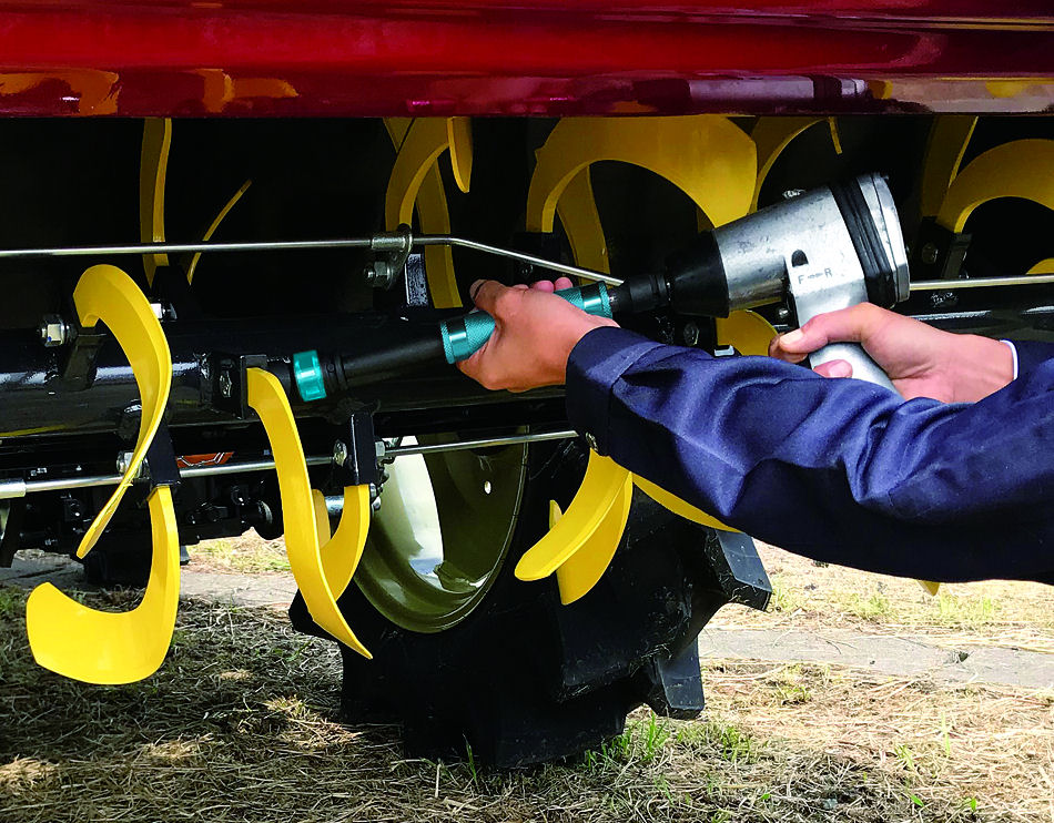 先端ソケットは飛散防止の固定式17mm。インナーテンションバーーのみが回転し、グリップ部は回転しないアルミ製。エクステンションバーの回転による火傷の心配もなく、エアーインパクトレンチを使用する事で、手締め以上の高トルクで脱着が可能です。また、トラクター・ハローの爪替え作業時は、ロータリーロックを解除した状態で作業ができる為、効率的です。