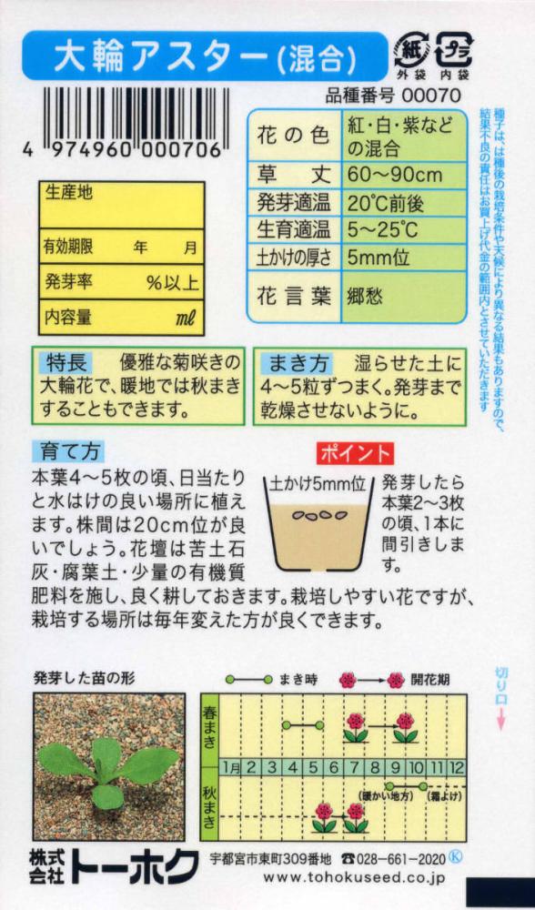●掲載のパッケージ画像(表側・裏側)に記載されている蒔き時期、収穫時期、発芽適温、発芽率、品種特長、その他注意事項をよくご確認の上、ご注文ください。